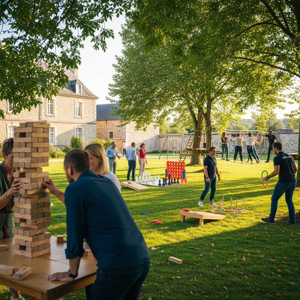 Les entreprises de la région — Nantes, Rennes, mais aussi les PME locales autour de Gennes-sur-Seiche — recherchent des activités permettant de renforcer la cohésion d’équipe tout en restant ludiques. Les jeux sportifs gonflables (courses, défis chronométrés) stimulent l’esprit de compétition saine, tandis que les jeux en bois géants favorisent la coopération et la stratégie collective. Le baby-foot ou les tournois de Molkky ajoutent une dimension festive et accessible à tous.