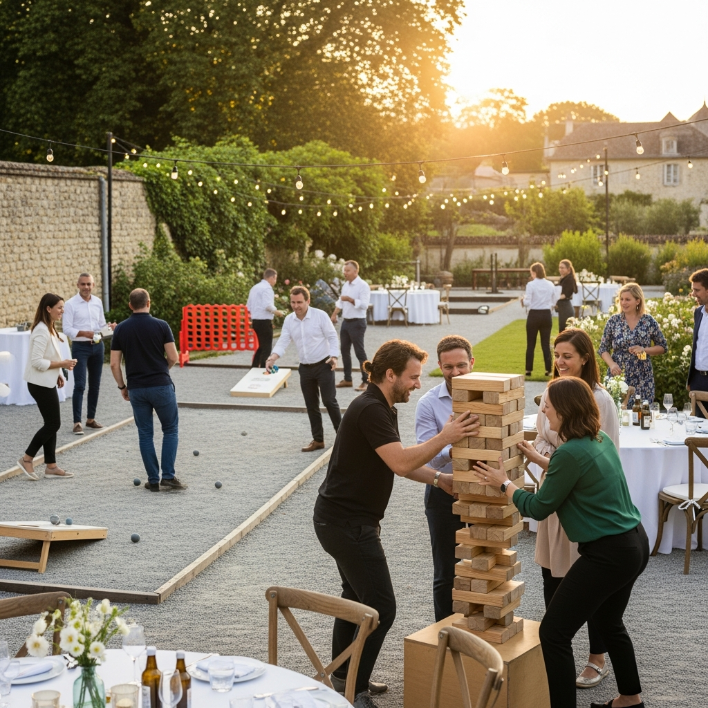 Pour une ambiance décontractée, installez des jeux en bois géants disséminés sur la pelouse : ils encouragent les échanges spontanés entre collègues sans pression compétitive. Un baby-foot, classique ou géant, devient rapidement le point de ralliement et crée des souvenirs partagés.
